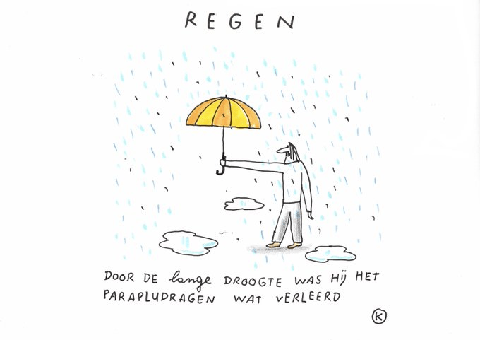 “Rain: because of the long drought he’d forgotten how to use an umbrella” Source: Kamagurka.